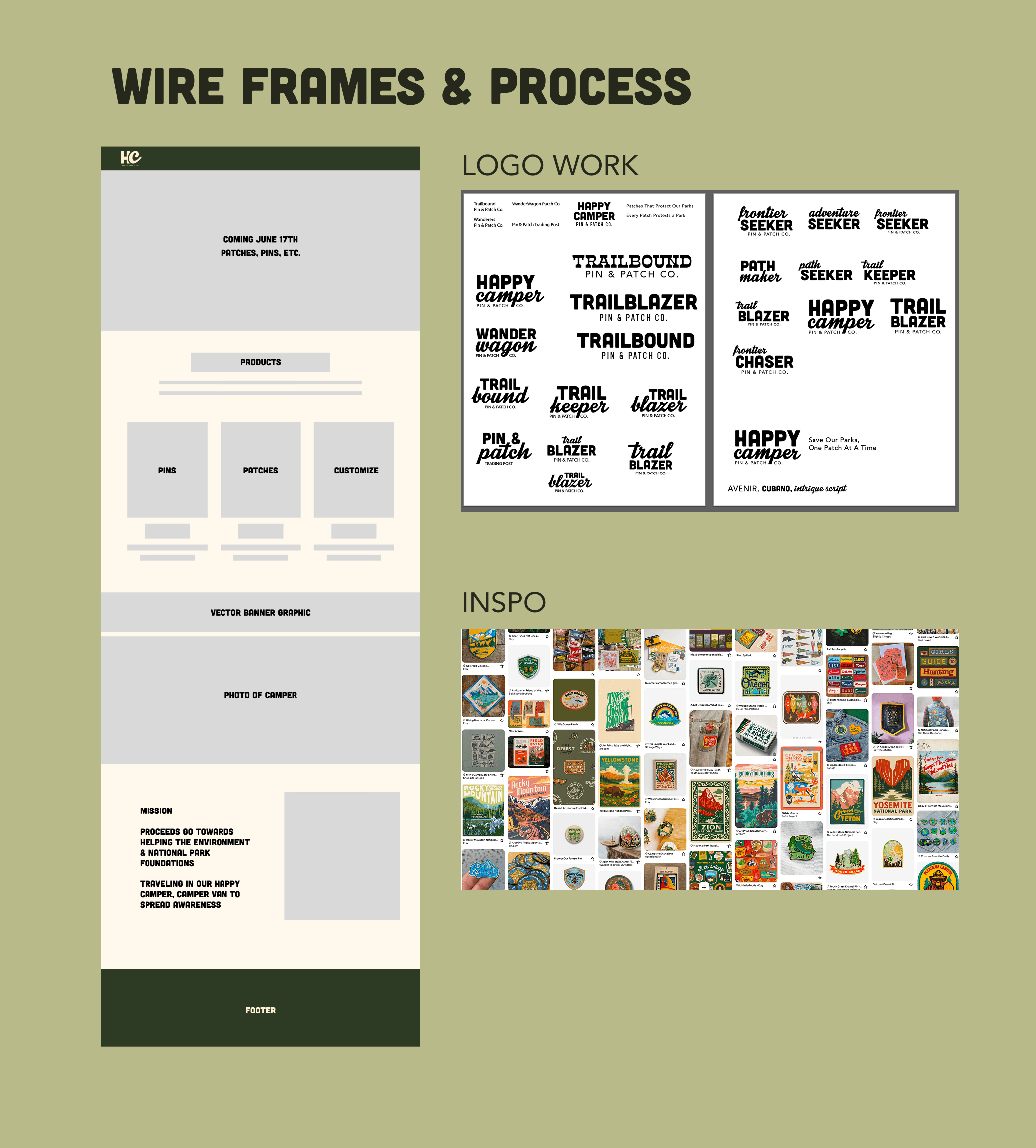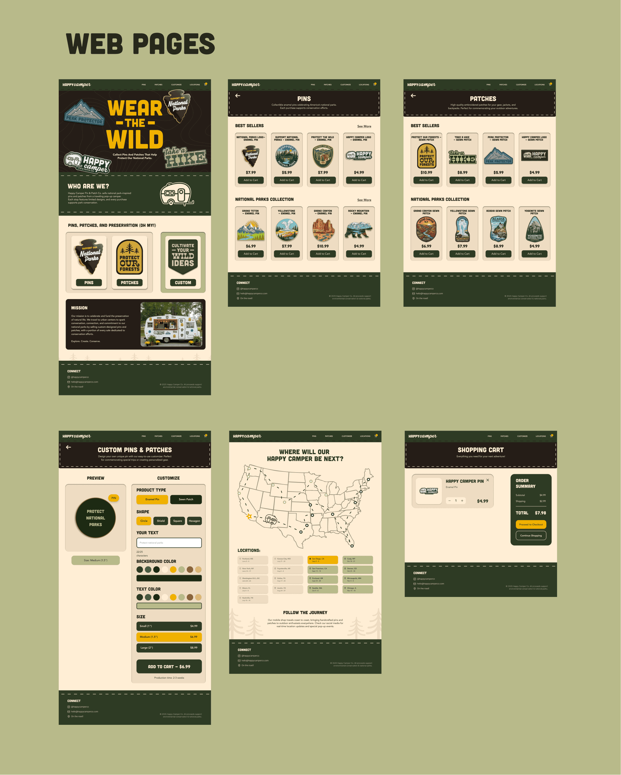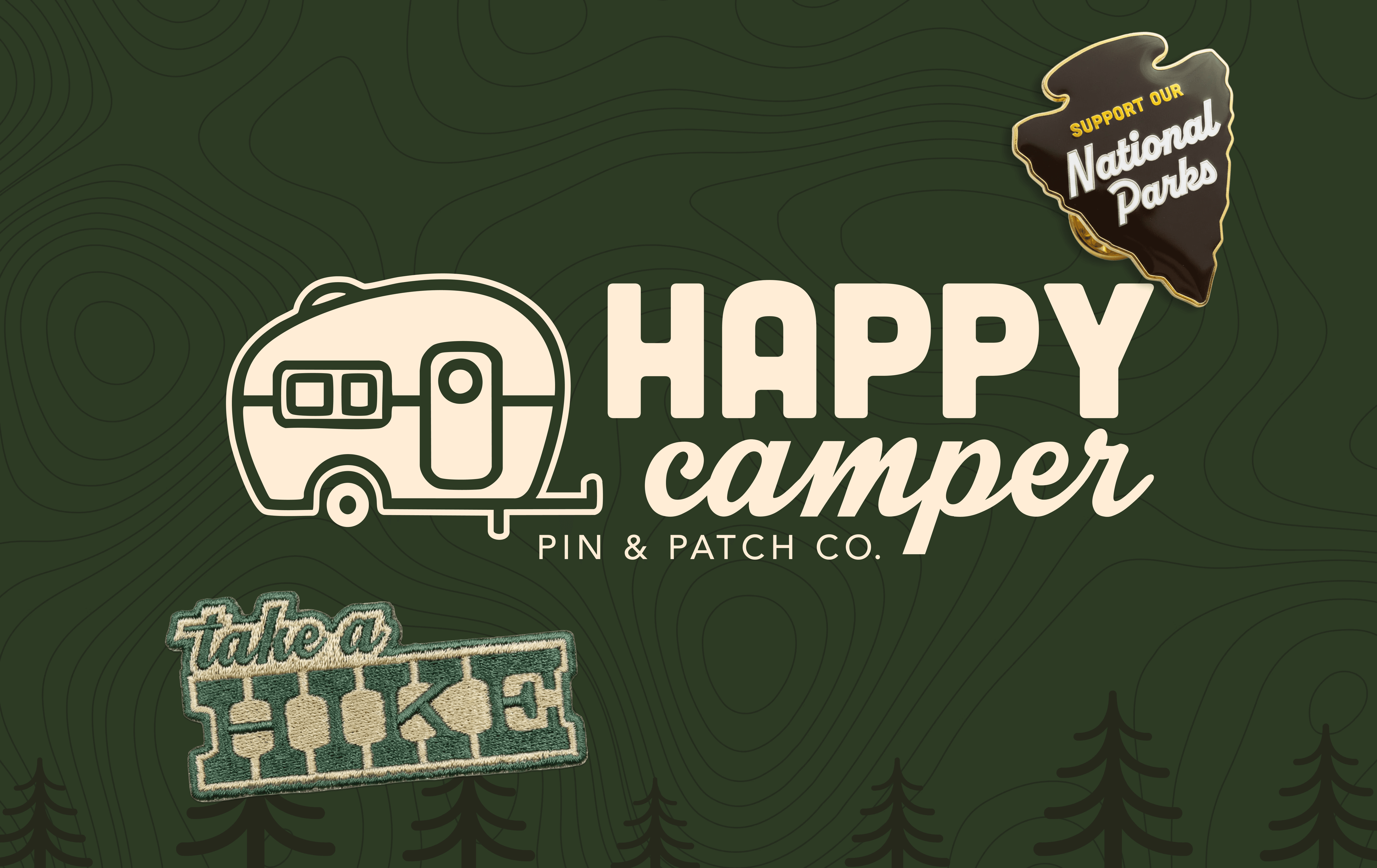 Happy Camper is a traveling enamel pin and patch shop that encourages engagement with the natural world, with all proceeds supporting national park funding. The launch website showcases featured products while building excitement around where the camper will travel next. I developed the branding system and designed several pins and patches, then used AI tools to render them realistically. Many of the location-specific national park designs were generated using AI to expand the collection efficiently.
