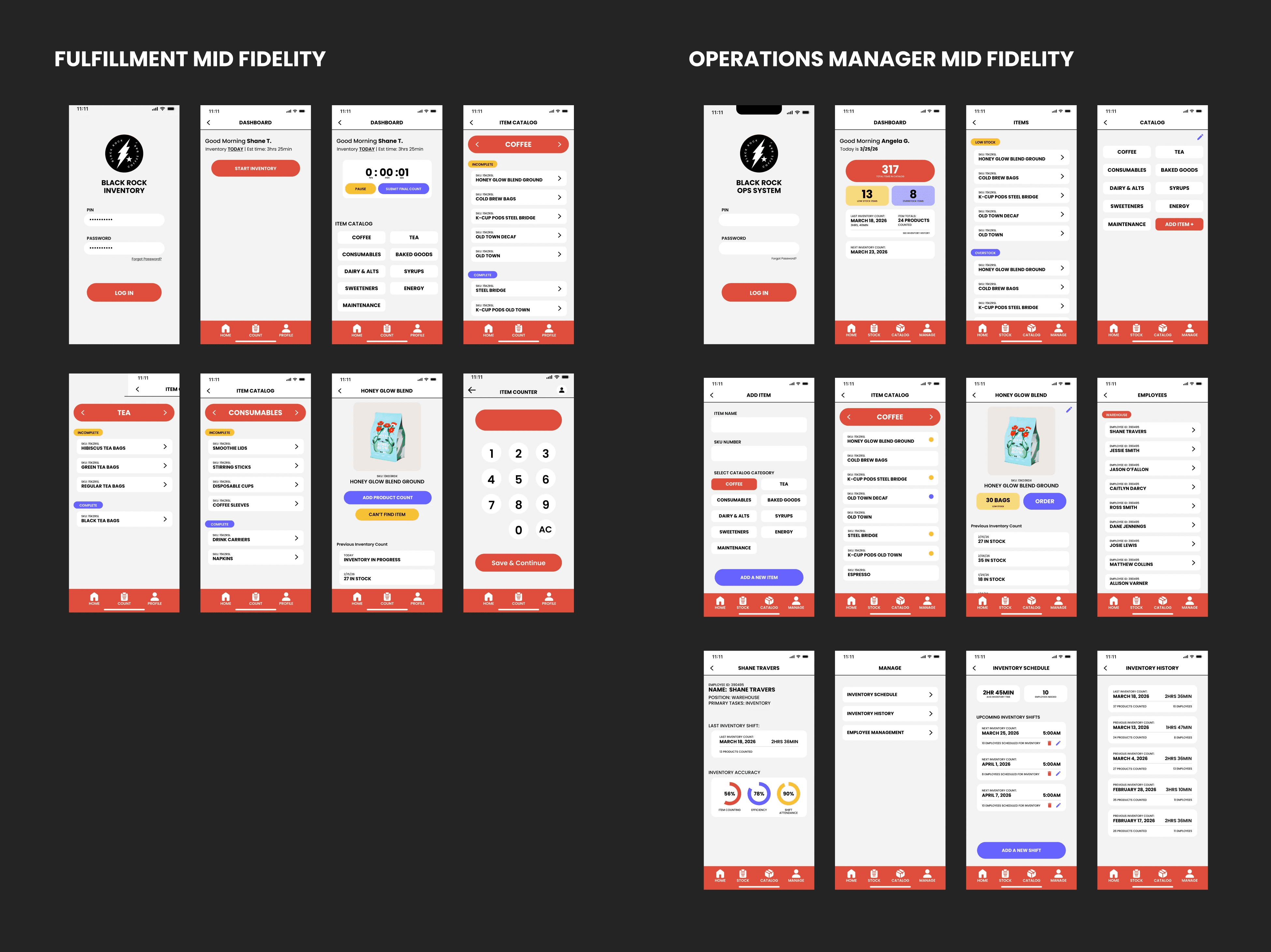 Initial System Architecture - For the original assignment I was assigned a random, real, coffee brand to replicate their look and use it on my app systems. This is why you can see the Black Rock Coffee Bar branding in these mid fidelity screens.
