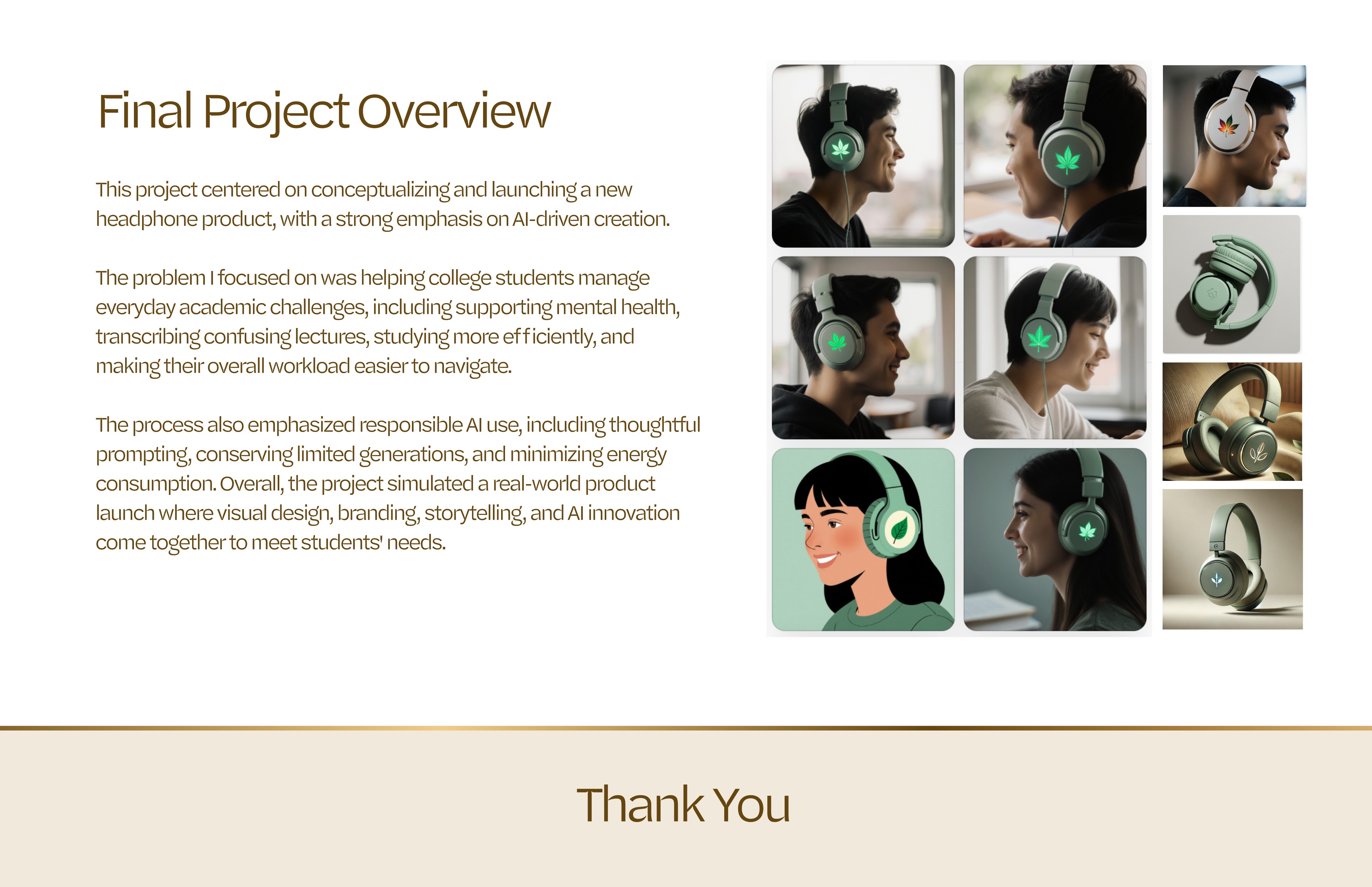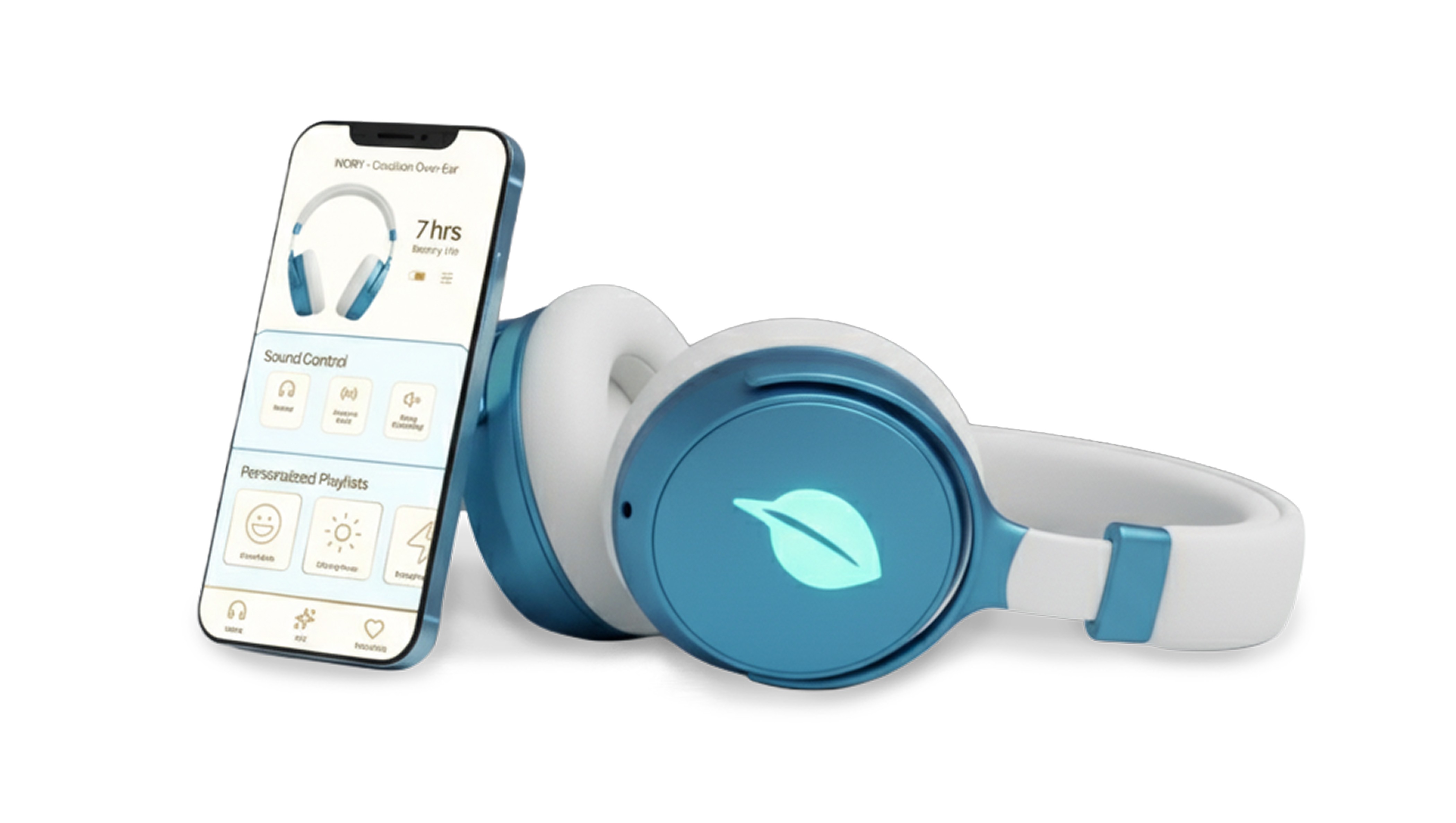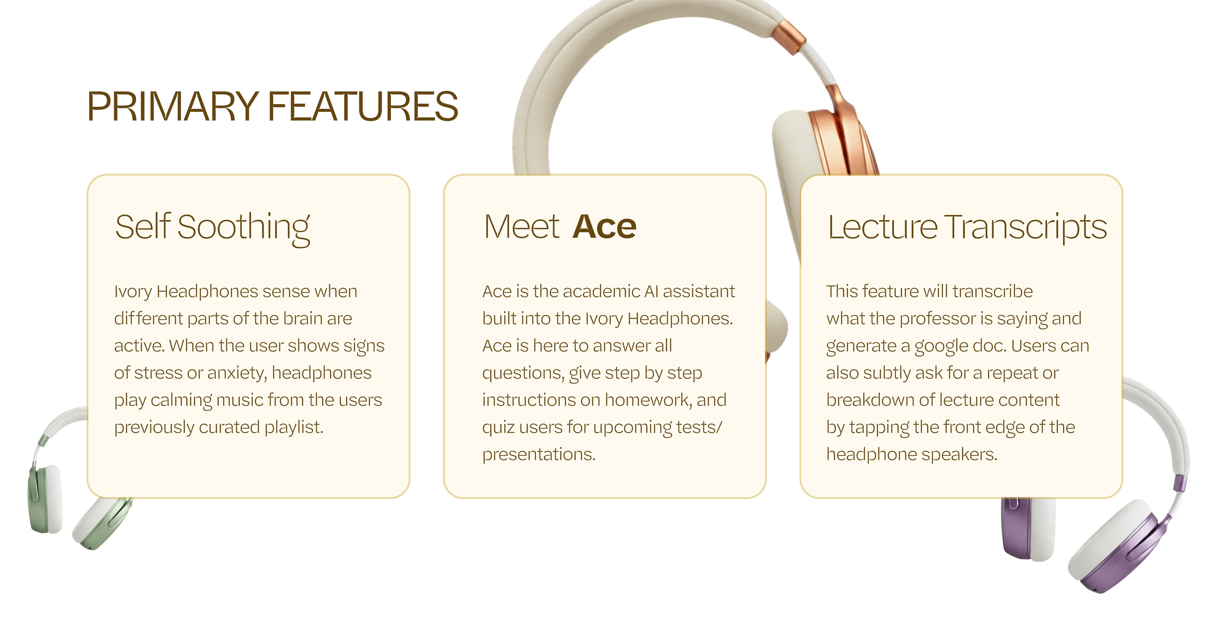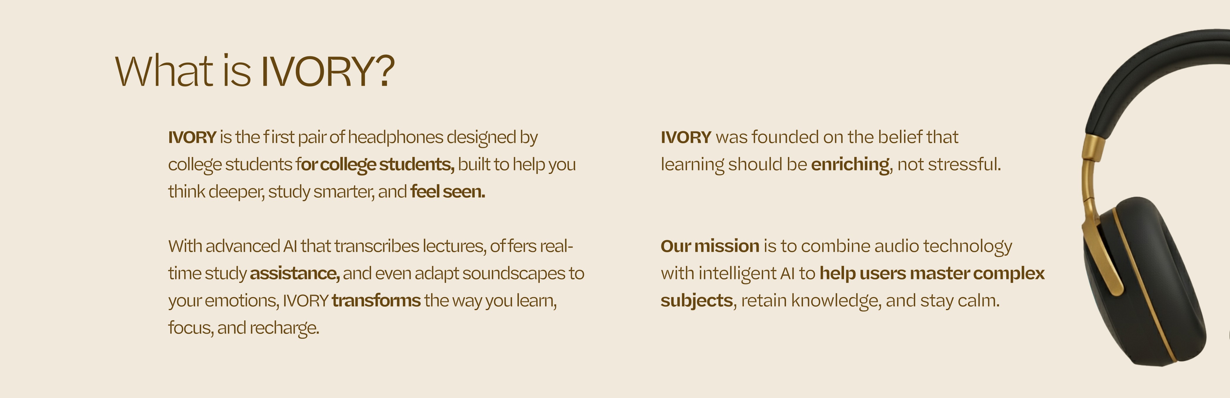 IVORY is a pair of headphones designed by students, for students, to support studying, note taking, and emotional regulation. Through adaptive lighting and personalized music playlists, IVORY helps users recognize and alleviate strong emotions while staying focused. The headphones and accompanying imagery were created using a combination of AI tools to explore form, interaction, and visual storytelling.